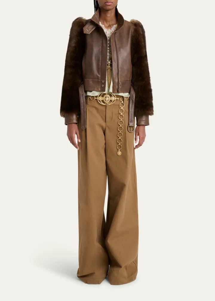 Faux Fur Sleeves Leather Bomber Jacket